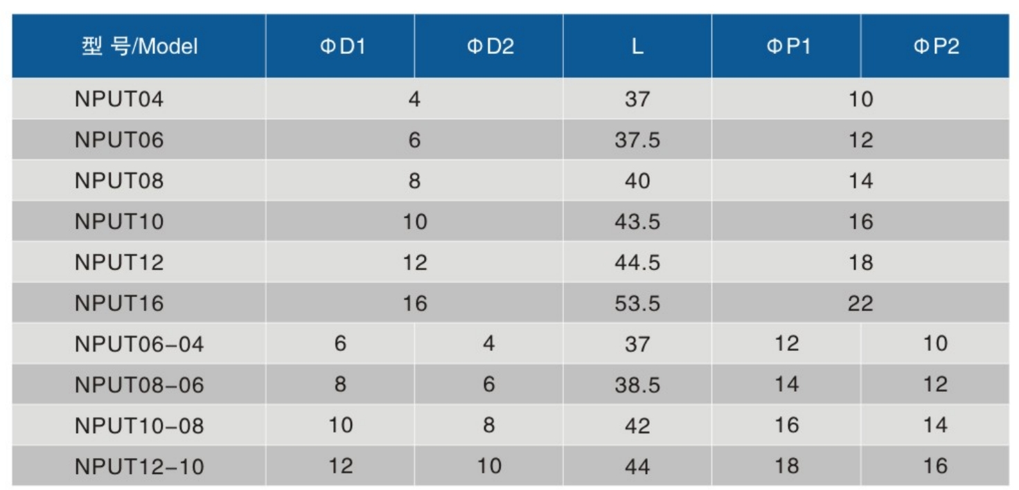 The pneumatic tube fittinos are of excellent flame resistance, heat resistance, and splash resistance·When inserting or unplugging a tube, press the button down to easily insert and unplug without damaging to tubeAfter installation of the straight, three-way, four-way, and other terminal connectors, simply rotate the fittings bodyto adjust thedirection of the tube.