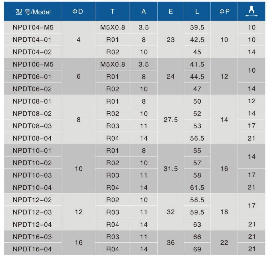 • Thread Specifications:M5X0.8、R01、R02、R03、R04