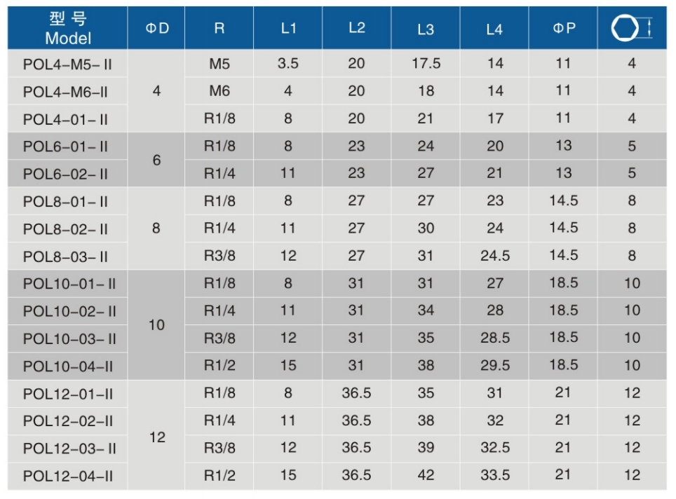 • Thread Specifications:M5、R1/8、R1/4、R3/8、R1/2